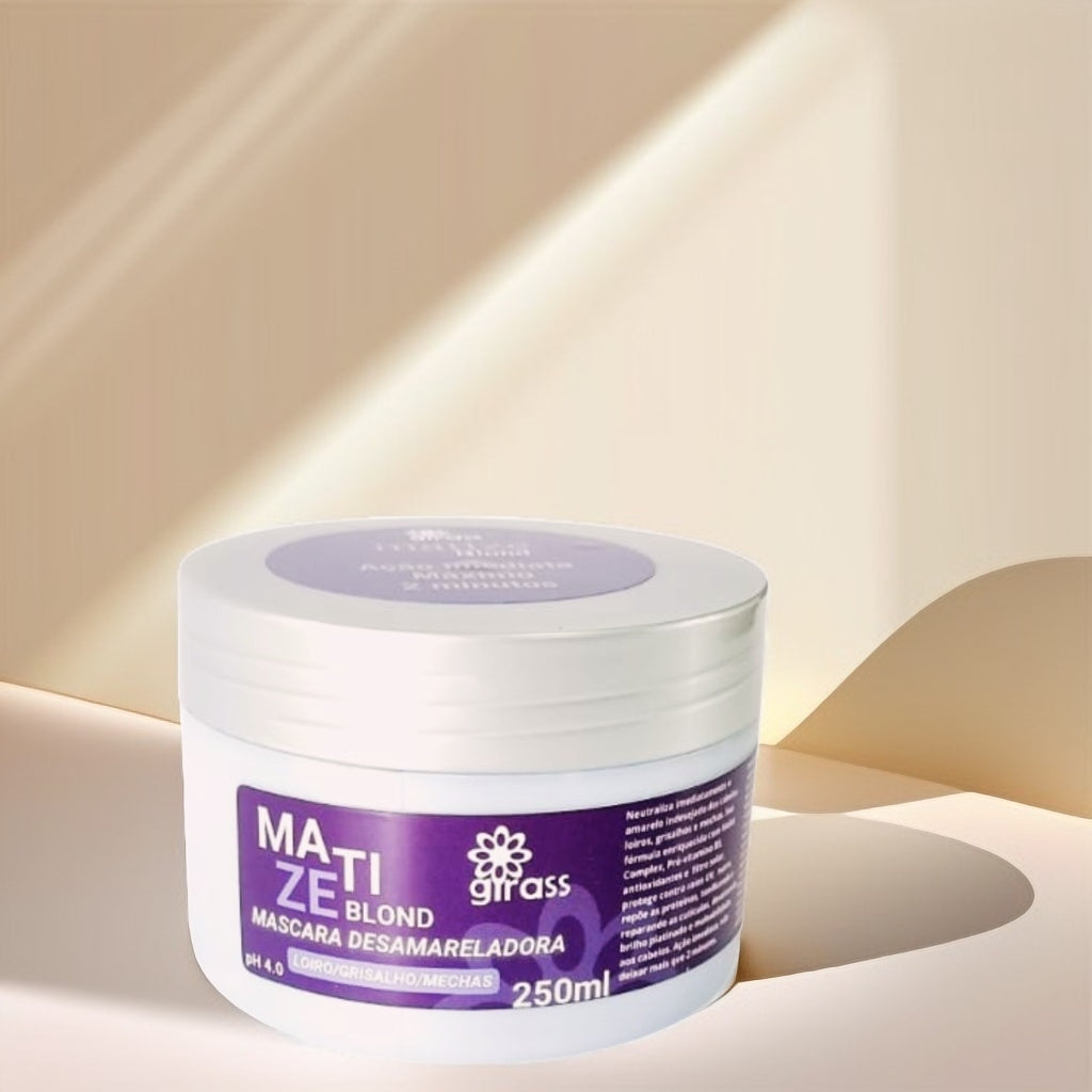 A Máscara Matizadora da Girass, devolve vida e movimento sem pesar. Sua fórmula é um extrato de açaí, camomila e uva para equilibrar e dar brilho, manteigas de cacau e karité + vitamina E para nutrir e hidratar e queratina vegetal para selar o frizz, e evitar o ressecamento e tons amarelados dos fios.
