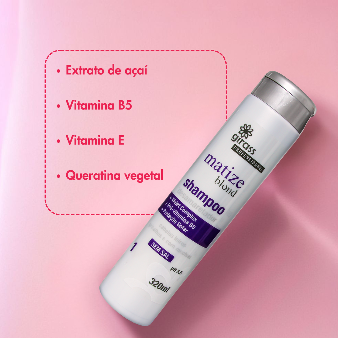 Como usar: Aplique o Shampoo Matizador Girass nos cabelos molhados, massageando suavemente até formar espuma. Deixe agir por 2 a 3 minutos e enxágue bem. Para melhores resultados, utilize também o Condicionador Matizador Girass.